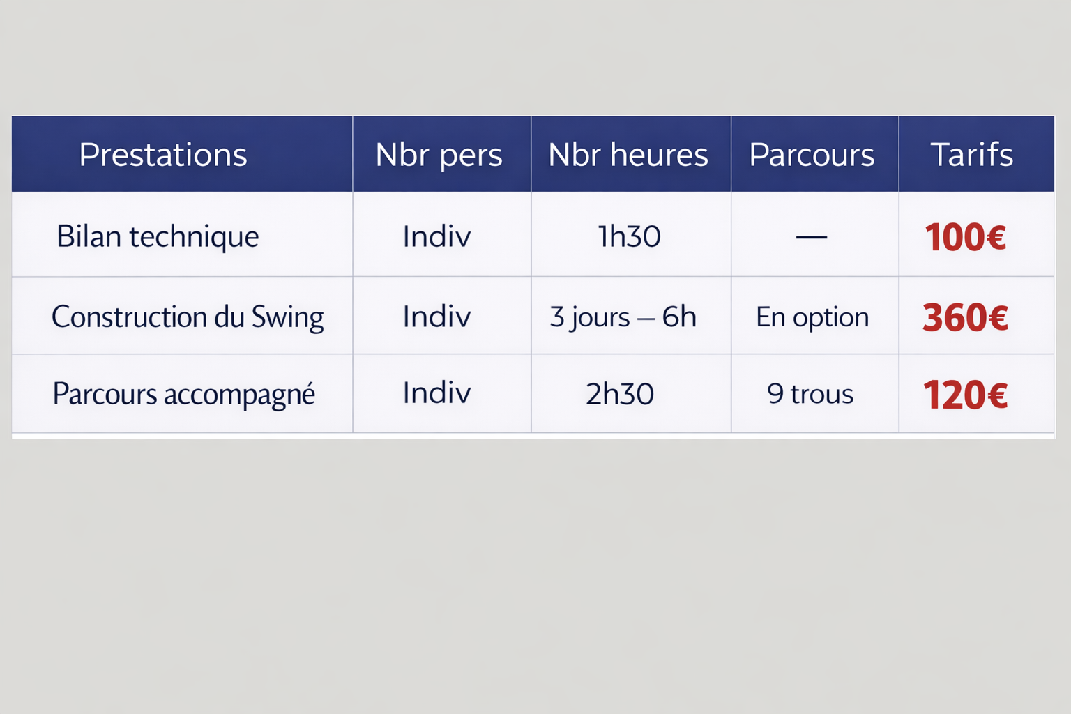 Que vous souhaitez retravailler vos fondamentaux, gagner en régularité sur le parcours ou améliorer votre petit jeu, nos formules s’adaptent à vos objectifs pour vous permettre d’aborder la saison estivale avec confiance et performance